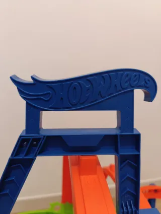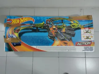 Circuito de acción Hot Wheels Colossal Crash. - Incluye múltiples pistas y zonas de choque. - Diseñado para carreras y acrobacias. - Apto para niños de 5 años en adelante. - Se ha usado muy poco