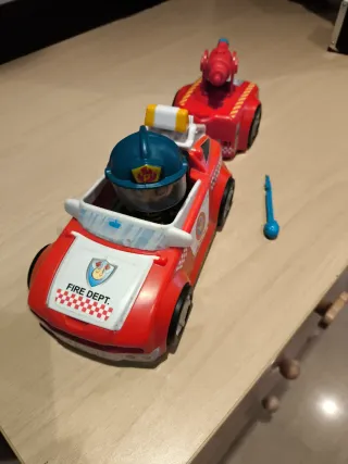 Set de bomberos Pinypon con dos vehículos y accesorios. - Coche de bomberos rojo con figura. - Camión de bomberos rojo con cañón de agua. - Figura de bombero con casco azul.