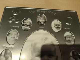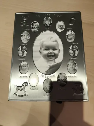 Marco de fotos para seguir el crecimiento de un bebé durante su primer año. - Diseño metálico plateado. - Espacio para 12 fotos de 1 mes a 1 año. - Foto central para el primer cumpleaños. - Incluye figura decorativa de caballito balancín.