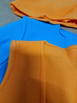 Disfraz de enanito para niño, ideal para fiestas o carnaval. Incluye varias piezas para un look completo. - Camisa azul de manga larga. - Chaleco naranja. - Pantalón morado. - Cinturón negro con hebilla dorada. - Gorro naranja.