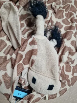 Disfraz de jirafa para niño, perfecto para fiestas o carnaval. El diseño imita el pelaje característico de la jirafa con manchas marrones sobre fondo beige. - Incluye capucha con cuernos y melena. - Puños y tobillos negros. - Cola con pelo negro.