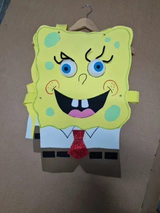 Disfraz casero de Bob Esponja, ideal para fiestas o eventos. - Diseño inspirado en el personaje de Bob Esponja. - Incluye la cabeza y el cuerpo del disfraz. - Hecho a mano con fieltro y goma eva.