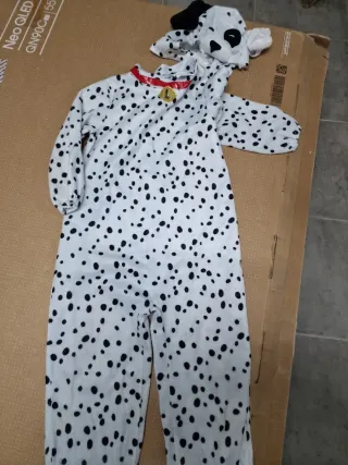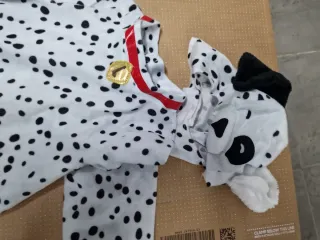 Disfraz de dálmata para niño, perfecto para fiestas o carnaval. Incluye capucha con orejas y collar. - Diseño de dálmata con manchas negras. - Capucha con cara de perro y orejas. - Collar rojo con medallón dorado. - Talla aproximada 4-6 años.