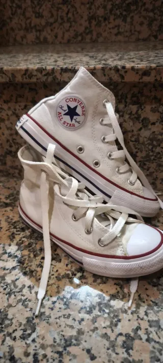 Zapatillas altas de lona de la marca Converse, modelo All Star. - Color blanco. - Cierre con cordones. - Detalle de doble línea en la suela (roja y azul). - Logo circular de Converse All Star en el lateral. - Talla 30