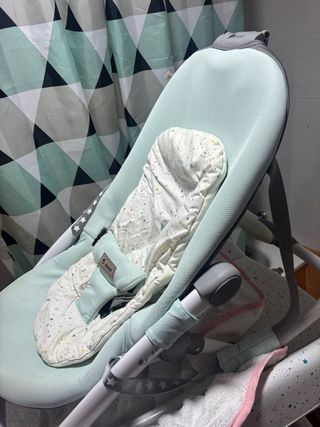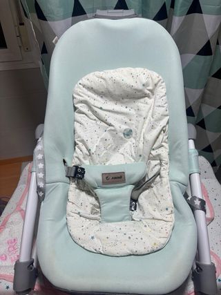 Hamaca para bebé de la marca Jane. Es cómoda y segura para los más pequeños. - Color menta y blanco con estampado de estrellas. - Incluye reductor para recién nacidos. - Arnés de seguridad de 5 puntos. - Respaldo reclinable en varias posiciones.