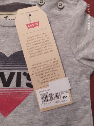 Vestido de bebé niña de la marca Levis, talla 6 meses. La parte superior es gris con un estampado de corazón y el logo de Levis, y la parte inferior es una falda vaquera. Nunca usada. Tiene la etiqueta. Tengo muchas más cosas de niños en mi perfil. - Talla: 6 meses - Color: Gris y vaquero - Estampado: Corazón con logo Levis
