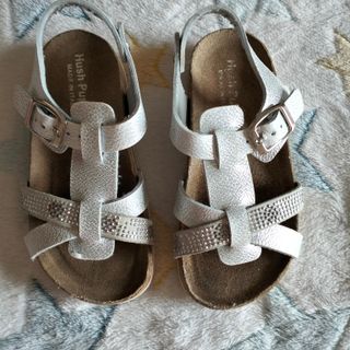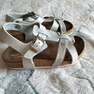 Sandalias plateadas para niña de talla 27. Diseño con tiras y detalle de pedrería. Cierre con hebilla. Hago lotes si te interesan más cosas de mi perfil. PUestas pero en buen estado.