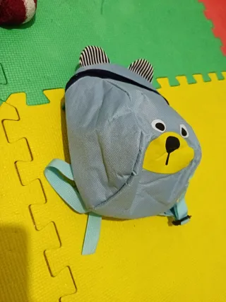 Adorable mochila infantil con diseño de oso. - Color azul. - Orejas a rayas. - Detalle de cara de oso con nariz y boca. - Cierre de cremallera.