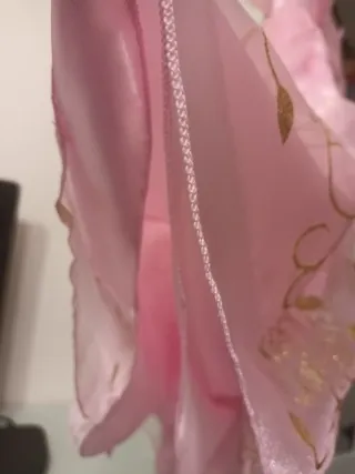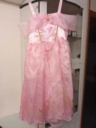 Vestido de princesa en color rosa, con un largo de 97 cm. Incluye todo lo que se ve en las fotos. - Diseño con detalles dorados. - Tejido satinado y tul. - Adorno floral en la cintura.