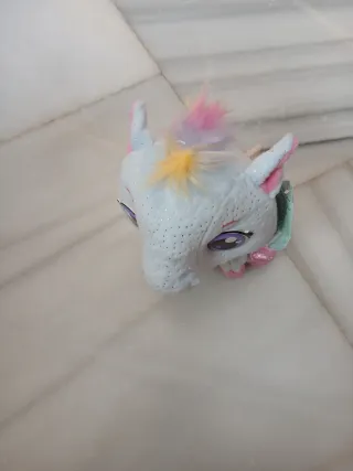 Adorable peluche con forma de unicornio. - Color blanco con detalles brillantes. - Melena y cola multicolor (rosa, amarillo, lila). - Ojos grandes y morados. - Orejas y patas con acabado brillante.