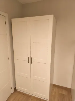 Armario blanco de IKEA, ideal para habitaciones infantiles. Sus medidas son 100 cm de ancho, 60 cm de fondo y 202 cm de alto. - Diseño de puertas con paneles. - Tiradores metálicos. - Acabado en color blanco.