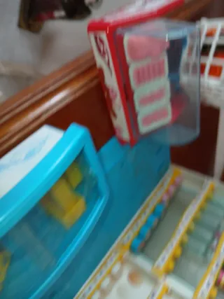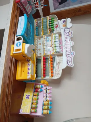 Divertido supermercado de Barriguitas con muchos accesorios. - Incluye estanterías con productos. - Carrito de la compra. - Caja registradora. - Frutas y verduras. - Botellas de leche y yogures.
