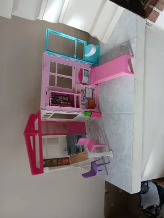 Casa de muñecas estilo Barbie, con varios niveles y habitaciones. - Estructura de plástico rosa y azul. - Incluye muebles como cama, sillas y cocina. - Diseño abierto para fácil acceso a las habitaciones.