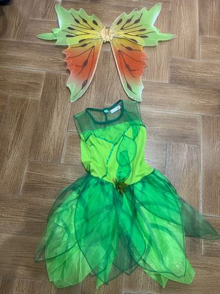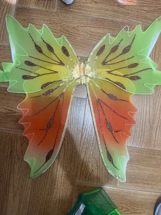 Conjunto de disfraz de hada en tonos verdes, perfecto para fiestas temáticas o disfraces. - Alas de hada con diseño degradado de verde a naranja y detalles brillantes. - Vestido de hada con falda de tul multicapa en verde. - Adorno floral en la cintura del vestido. Un solo uso como nuevo talla para niñas 10-11