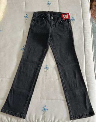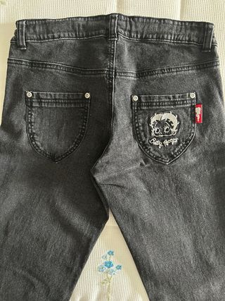 Pantalón vaquero de color negro un poco elástico y con botón en su interior para graduar la cintura .Betty Boop bordada en hilo color plata en el bolsillo trasero.Cierre con botón y cremallera.Nuevo sin usar,resto de tienda,me quedan 2 unidades.El precio es de 1 unidad.
