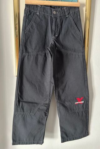 Pantalón de color gris oscuro y tejido 100% algodón es ideal para el entretiempo.Cierre con botón y cremallera y botón en el interior para ajustar la cintura.Tiene bolsillos delanteros y traseros.En un bolsillo trasero está bordado en hilo blanco la silueta de la cabeza de Mickey.Resto de tienda.Talla 8 años (128 cm).