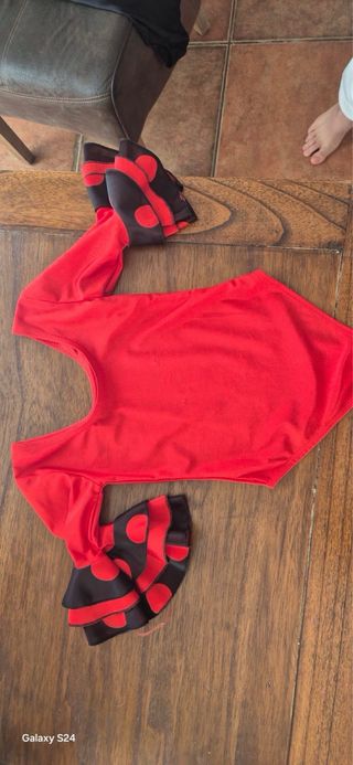 Precioso conjunto de flamenco para niña, ideal para fiestas o actuaciones. - Diseño con volantes y lunares. - Incluye 3 body flamenco, falda con lunares, cinturón flamenco - El mantón no se incluye en el pedido - Para niña de 5 años