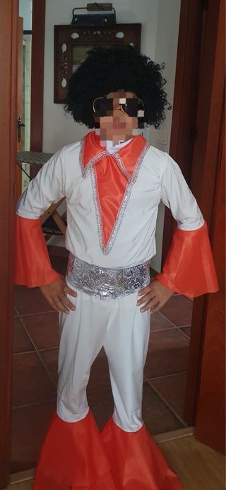 Disfraz de estilo retro inspirado en los años 70. - Traje blanco con detalles naranjas y plateados. - Pantalones acampanados. - Talla 12 años - Las gafas y la peluca no se incluyen en el producto