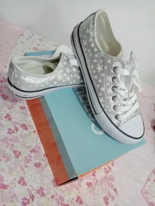Zapatos de la marca Conguitos N°37 , puestas solo en una ocasión. Con un diseño de estrellas plateadas, que se iluminan en la oscuridad al darles la luz solar. - Color plateado. - Estrellas decorativas. - Cierre con cordones blancos.