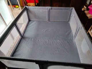 Parque infantil de la marca MS con unas dimensiones de 180x200 cm. Es un espacio seguro y amplio para que los más pequeños jueguen. - Estructura de tela y malla. - Color gris. - Incluye bolsillo lateral.