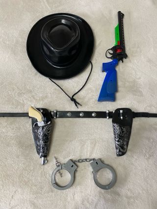 Set de accesorios para disfraz de vaquero infantil. Incluye todo lo necesario para completar el look. - Sombrero negro (hueco: 15cm ancho x 17,5cm largo) - Rifle de juguete con detalles en verde y azul (hace ruido como si dispararas) - Cinturón con dos fundas para pistola y una pistola (que no funciona - igual se puede reparar) - Esposas de juguete con llave.