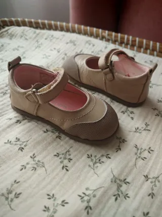 Merceditas de la marca Andanines en color beige, talla 19. - Cierre de velcro. - Detalle de textura en la puntera. - Interior en color rosa.