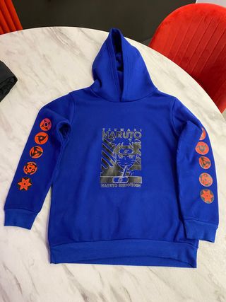 Sudadera azul para niño con diseño de Naruto Shippuden. Muy calentita. Talla 150 cm (10-12 años) - Estampado frontal de Naruto. - Dibujos de Sharingan y Rinnegan en las mangas. - Capucha. - Puños y cintura elásticos.