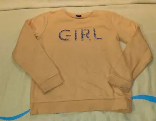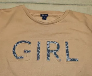 Sudadera de manga larga con la palabra GIRL estampada en la parte delantera. El diseño de las letras es llamativo y original. La sudadera está perfecta, sólo que la tela de las letras está un poco despegada. Se le pueden quitar o pegar. - Color: Melocotón - Marca: KIABI - Diseño: GIRL con estampado interior - Cuello redondo - Puños y bajo elásticos - Las letras están gastadas C2