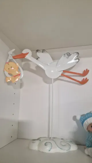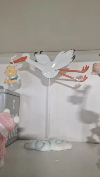 Figura decorativa de una cigüeña portando un bebé, ideal para tartas de bautizo o decoración. - Diseño de cigüeña blanca con pico y patas naranjas. - Bebé con pañal azul. - Base con forma de nube.