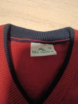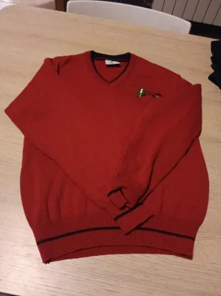 Vendo jersey de punto rojo de uniforme de calle con cuello en V y ribetes negros. Presenta un pequeño bordado en el pecho CIE. - Color: Rojo - Cuello: Pico - Talla: 12 - Ribetes: Negros