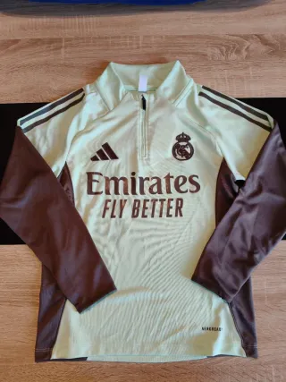 Conjunto de chándal infantil del Real Madrid. - Parte superior de color verde menta con cremallera. - Pantalón de color marrón. - Logos del Real Madrid y Adidas. - Inscripción Emirates FLY BETTER en la parte superior.