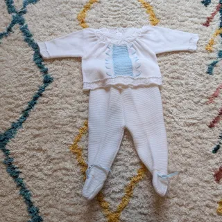 Precioso conjunto de punto para bebé. Talla 3 meses, está nuevo sin usar. Color blanco con detalles en azul.