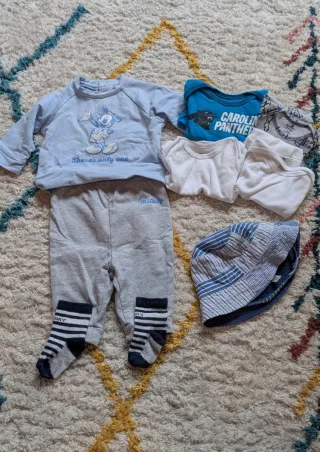 Lote de 10 prendas de ropa para bebé de 0 a 3 meses. Incluye: - 4 bodys de manga larga. - 1 pijama de terciopelo - 2 conjuntos de cuerpo entero - 1 gorro de Winnie de Poh - Unos patucos de Dumbo - Un short de Mayoral. Prendas de diversas tallas como Mayoral, H&M, Cat & Jack...