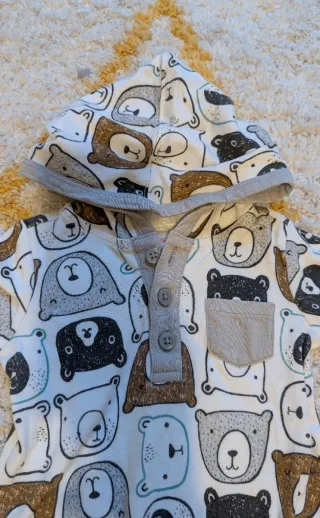 Mono con capucha para bebé, ideal para el entretiempo. Presenta un divertido estampado de ositos. Talla 6 meses (68cm). Cierre de botones en la parte delantera. Bolsillo en el pecho.