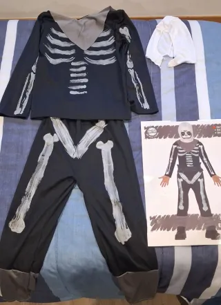 Disfraz de esqueleto para niño, ideal para fiestas o Halloween. Diseñado para edades de 7 a 9 años. - Incluye mono con diseño de esqueleto. - Capucha con estampado de calavera. - Tejido negro con detalles óseos en blanco.