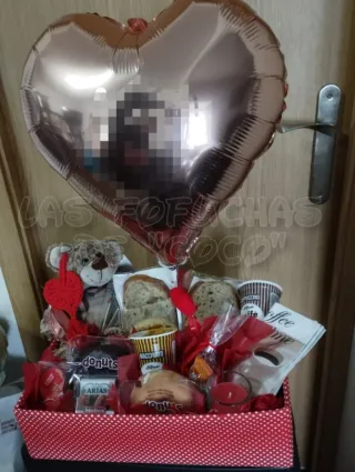 Prepara una sorpresa inolvidable con esta cesta. - Incluye peluche de oso. - Corazón de globo metálico. - Variedad de dulces y bollería. - Bebidas para disfrutar.