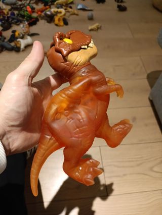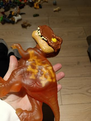 Figura de acción del T-Rex de Jurassic World de Goo Jit Zu. Es un juguete elástico y maleable. - Diseño del T-Rex. - Material elástico. - Color naranja translúcido.