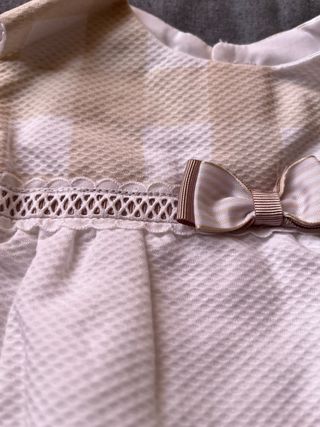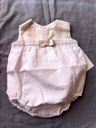 Ranita de bebé para 3 meses. A estreno aún con la etiqueta. Tejido con textura y forro. color blanco y crema - Tejido principal blanco con estampado de cuadros beige. - Adorno de puntilla y lazo en la parte delantera. - Mangas cortas y cuello redondo.