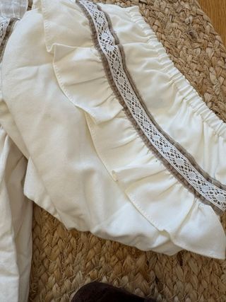 Conjunto de ropa infantil. - Chaqueta color camel con forro de cuadros de Zara. - Peto beige de James &Co. - Blusa blanca con cuello de volantes, de Gocco. Se regala al tener una pequeña manchita en el cuello bobo.