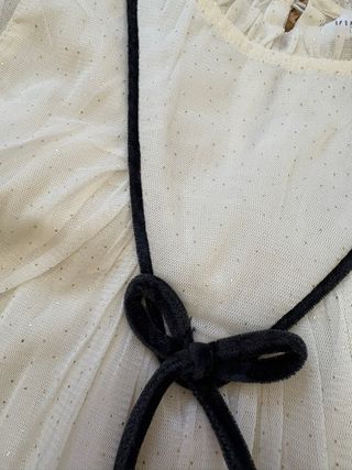 Vestido de tul con brillos dorados y detalle de lazo negro. - Manga larga. - Cuello redondo con volante. - Bajo con volantes.