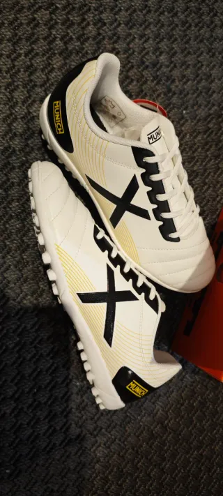 Botas de fútbol Munich para niño, color blanco con detalles en negro y amarillo. - Diseño deportivo. - Cierre de cordones. - Suela con tacos para césped artificial.