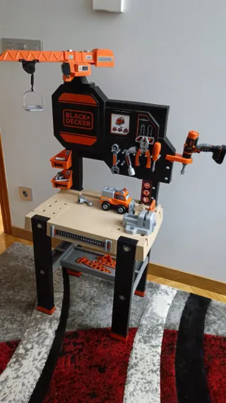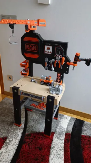 Mesa de construcción de juguete de la marca Black+Decker, con grúa. - Incluye accesorios como camión, herramientas y banco de trabajo. - Diseño robusto y colorido. - Ideal para fomentar la creatividad.