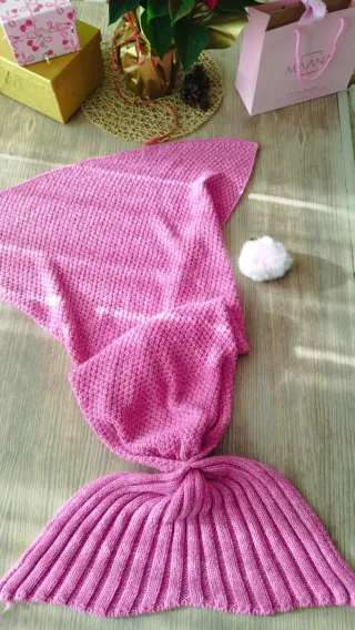 Manta tejida con forma de cola de sirena, perfecta para abrigarse. - Color rosa vibrante. - Diseño con escamas. - Tejido suave y cálido.