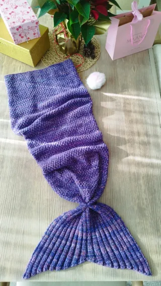Manta tejida con forma de cola de sirena, ideal para niños. Su diseño es divertido y acogedor. - Tejido suave y elástico. - Color morado con matices. - Forma de cola de sirena.