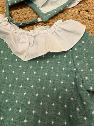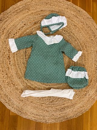 Conjunto de ropa para bebé de la marca La Ormiga, talla 9 meses. Incluye vestido, braguita y gorrito. - Vestido verde con estampado de topos blancos. - Cuello volante blanco. - Mangas abullonadas con puño blanco. - Braguita a juego con volante blanco. - Gorrito a juego con detalle blanco.
