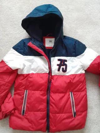 Plumífero infantil Kids El Corte Inglés en colores rojo, blanco y azul marino. Ideal para el frío. - Cierre de cremallera. - Capucha. - Detalle de número '75' en el pecho.