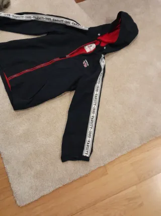 Cazadora infantil de El Corte Inglés, talla 11/12 años. Perfecta para el entretiempo. - Diseño en color azul marino. - Forro interior en color rojo. - Detalle de banda lateral con texto. - Capucha integrada.