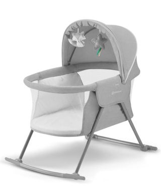 Minicuna de la marca Kinderkraft en color gris. Ideal para los primeros meses del bebé. - Estructura ligera y plegable. - Laterales de malla transpirable. - Capota ajustable. - Incluye un móvil con peluches.