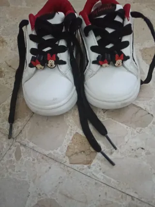 Botines blancos para niña con diseño de Minnie Mouse. - Cierre con cordones negros. - Detalle de Minnie Mouse en la parte delantera. - Forro interior rojo. - Suela blanca.