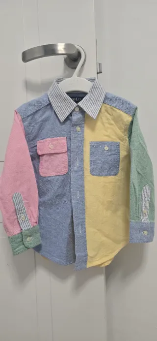 Camisa de manga larga de la marca Polo Ralph Lauren. - Talla 2T. - Diseño multicolor con paneles. - Cuello de rayas blancas y azules. - Bolsillo frontal en color rosa. - Bolsillo frontal en color azul.